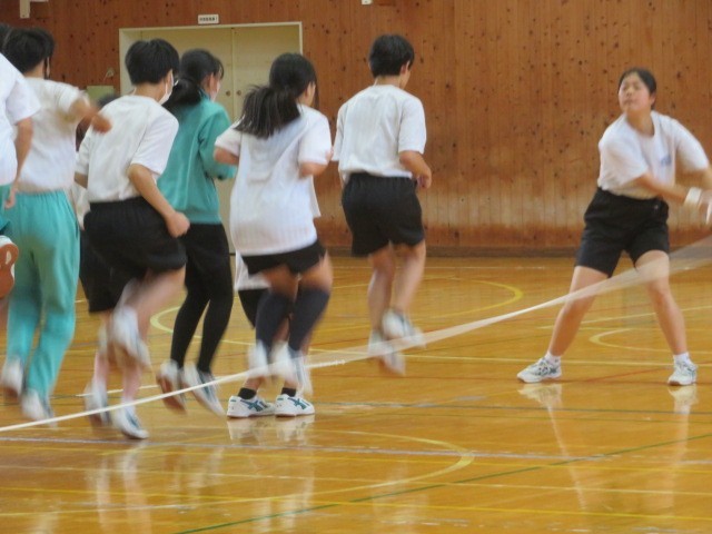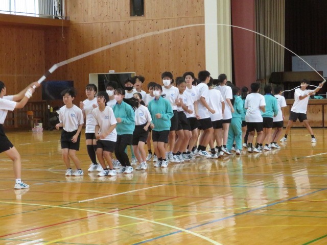 2年A組の保健体育の時間です。大縄跳びに挑戦しています。