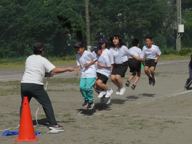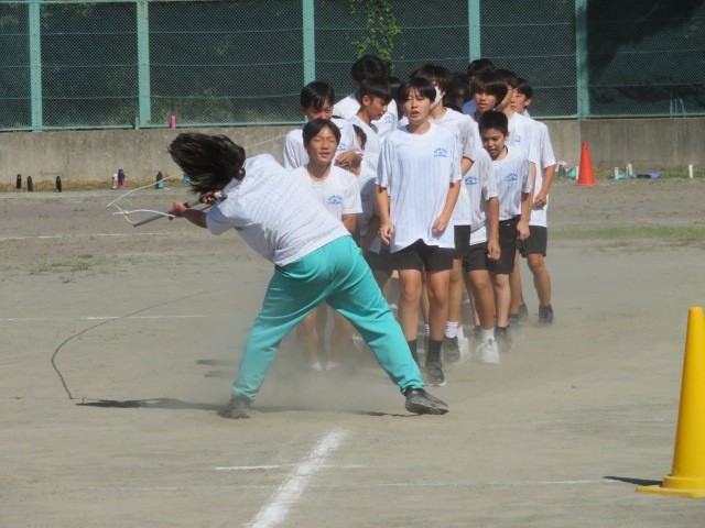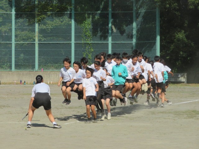 2年生・E組の学年練習です。大縄跳び、声を出して頑張りました。2年生の清流リレー、声援の中力一杯走り抜けました。