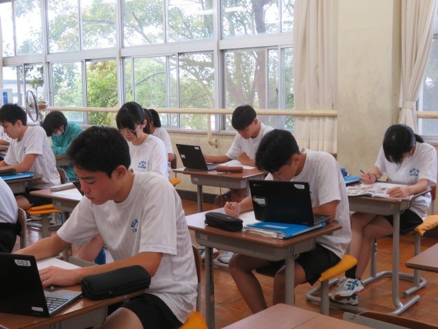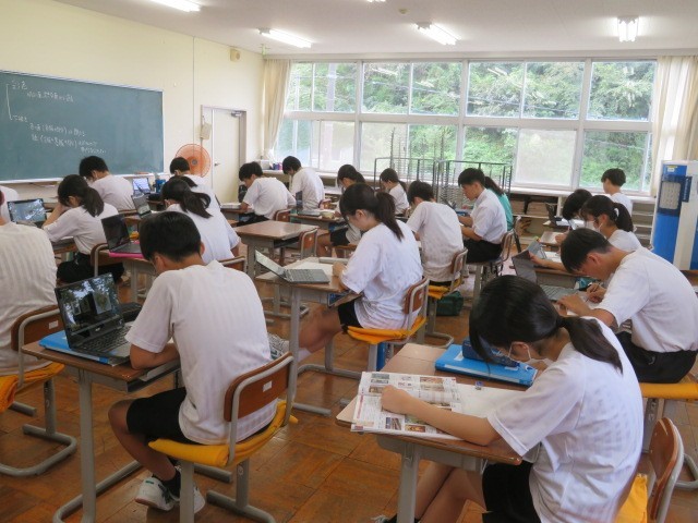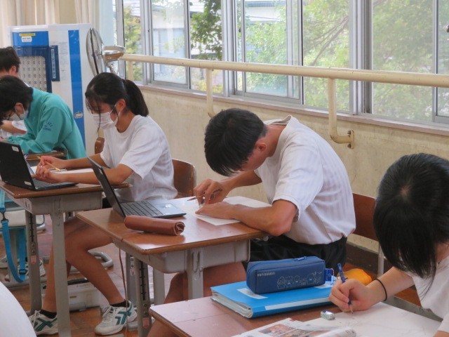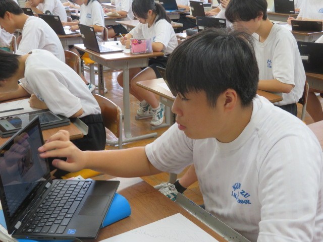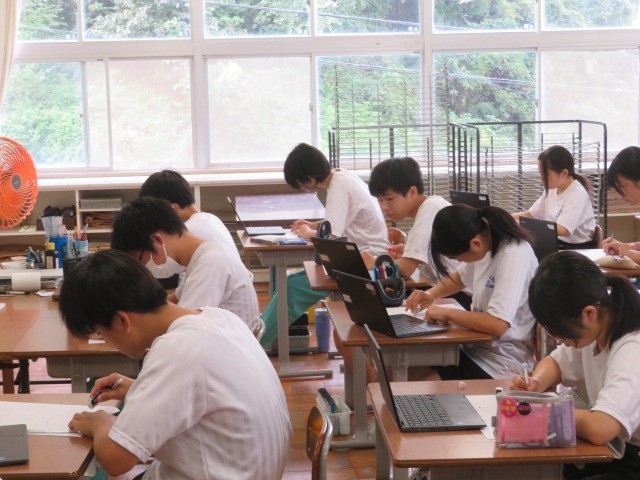 3年B組の美術の時間です。浮世絵を用いたパロディ、下書きも大分進んできているようです。