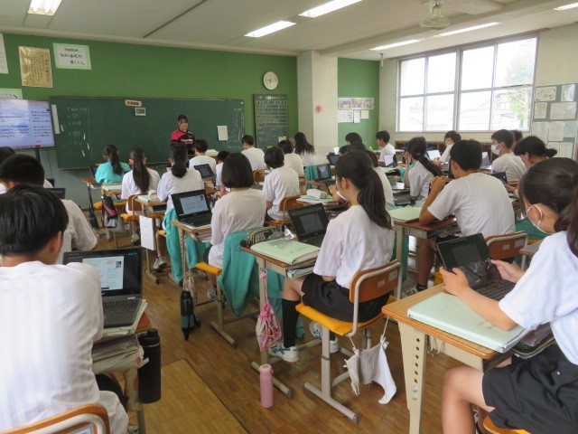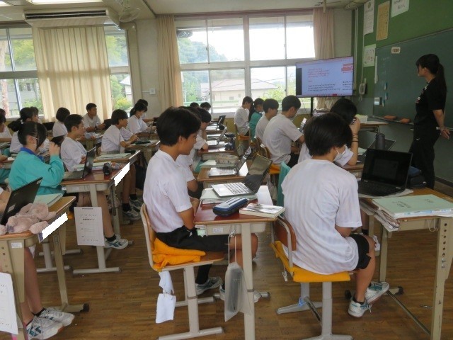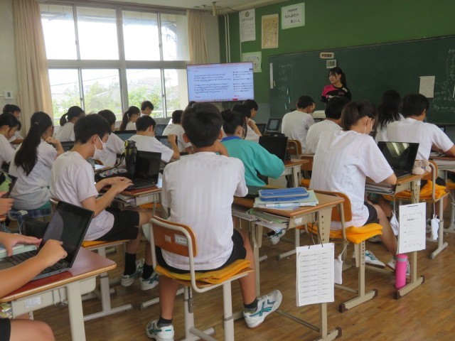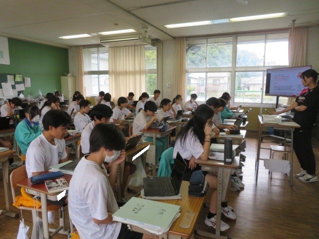2年B組の英語の時間です。授業スタート、英語の歌に挑戦です。日本で以前ヒットし、耳にすることも多い「I Was Born To Love You」を歌っています。英語独特の発音方法も学んでいきます。