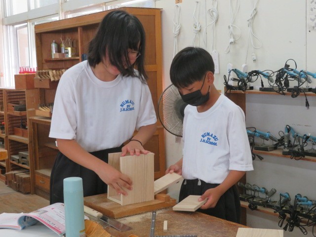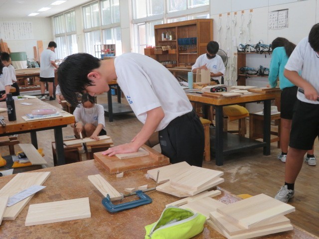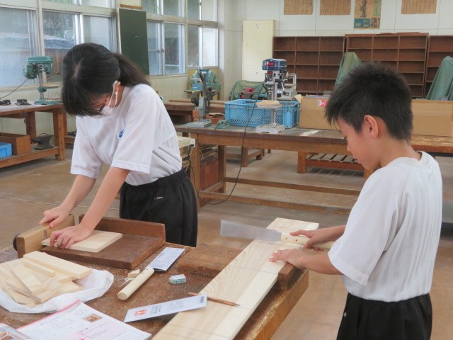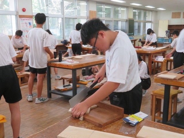 1年B組の技術科の時間です。木材加工の作業も大分進んできました。組み立てに入りそうな人も居ます。板をカットするのに苦戦している様子も見られました。慣れないのこぎり引きは大変です。