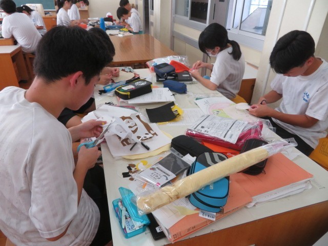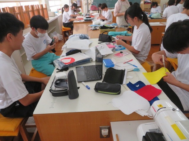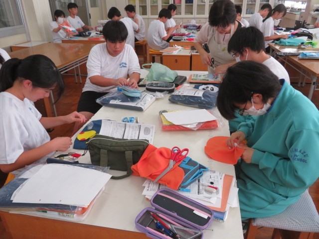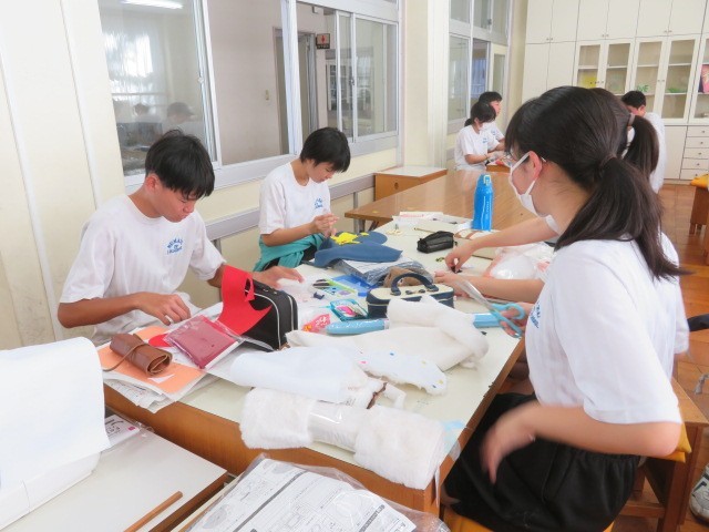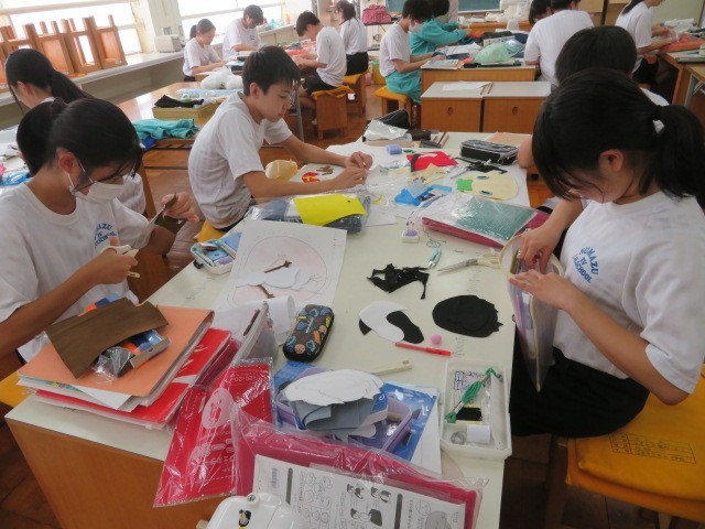 3年B組の家庭科の時間です。フェルトの裁断から縫いあわせへと作業が進んでいます。かわいいアップリケができそうです。