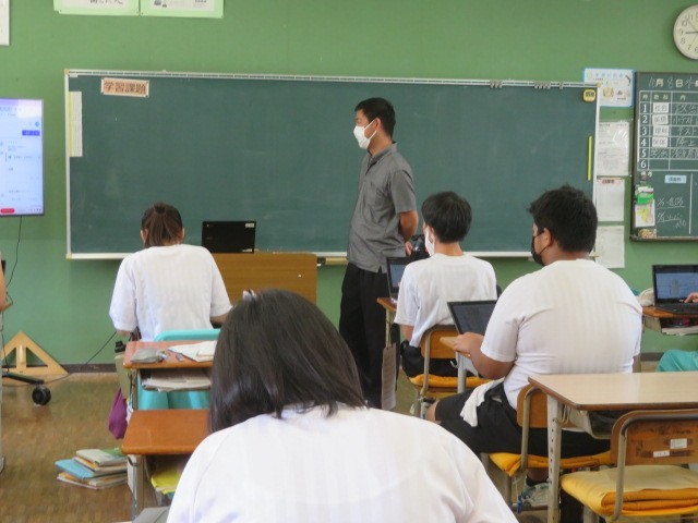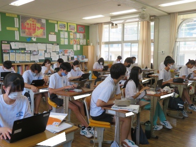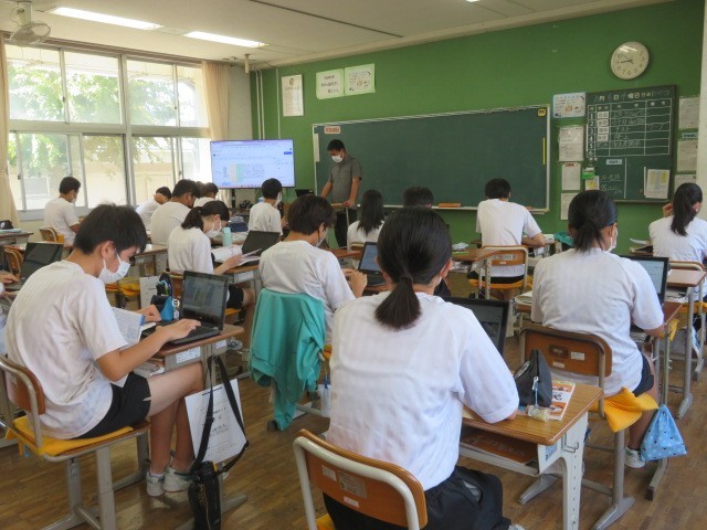 3年C組の社会の時間です。「政治」「選挙」などの学習を進めています。あと3年余りで選挙権を持ちます。有権者としてしっかりと考えられるように今の学習に取り組んでいきましょう。