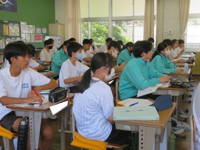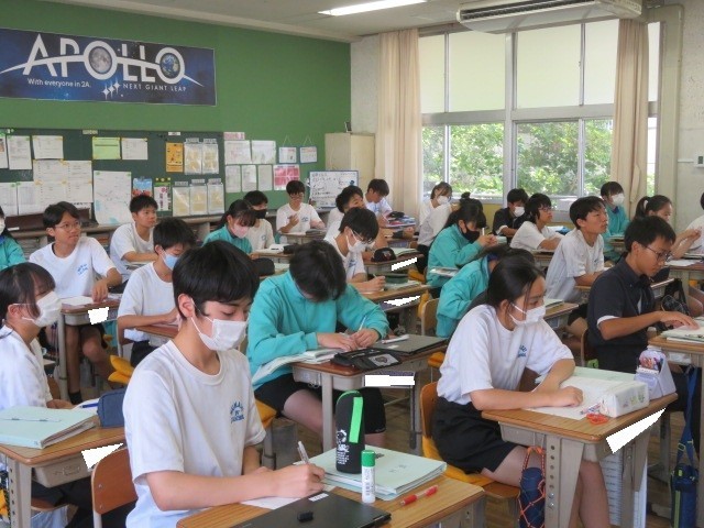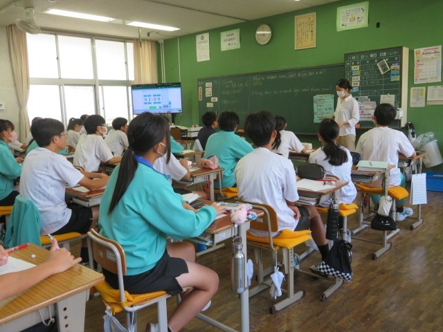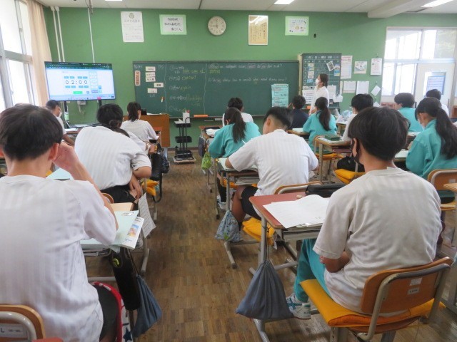 2年A組の英語の時間です。「have to~」を用いた疑問文に対する適切な受け答えができるように意見を出しています。