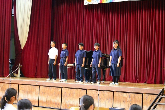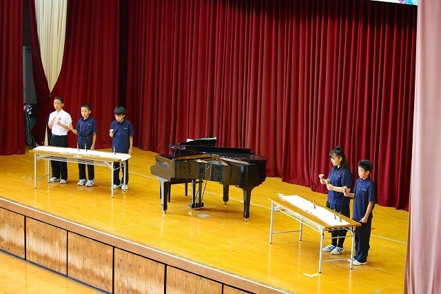 E組の今年の発表は、ジブリメドレー。歌、ギター、ハンドベル、琴、それぞれの曲で工夫して頑張りました。