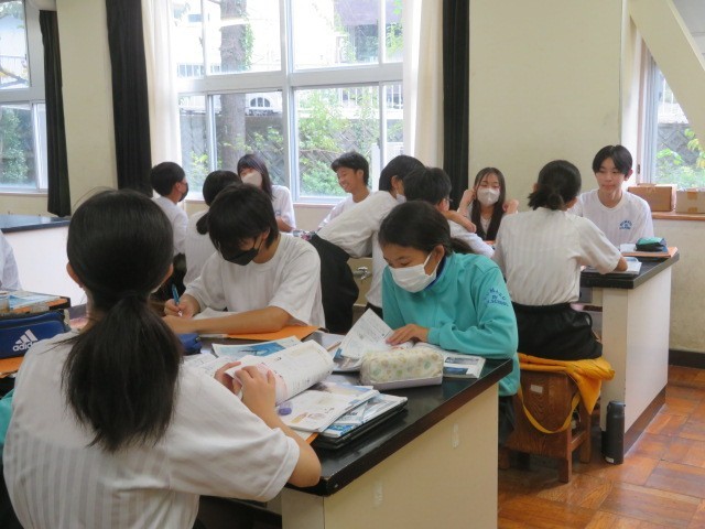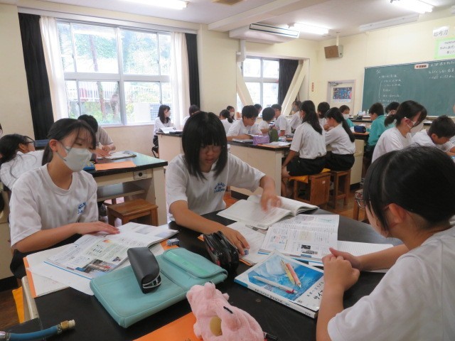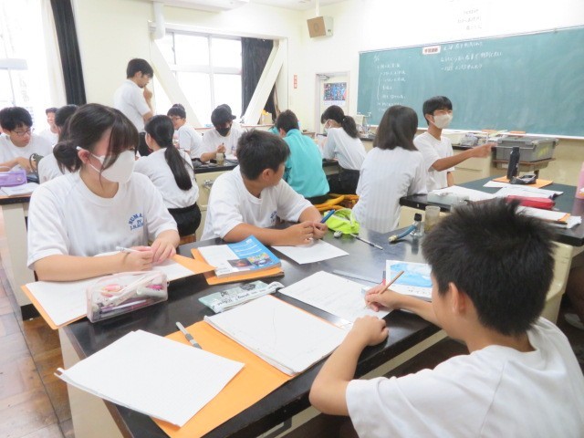1年B組の理科の時間です。「エタノール水溶液」「ミョウバン水溶液」「食塩水」「何も溶けていない」…いずれの水溶液かを確かめるための実験について各グループで相談しています。
