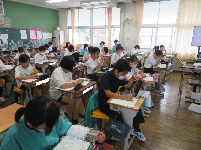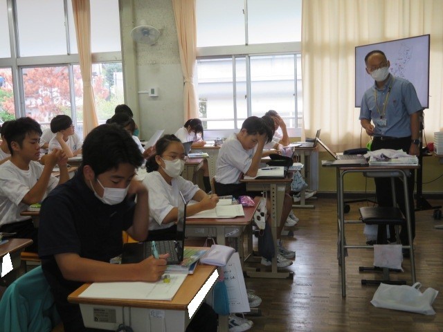 1年B組の社会の時間です。中国の農業について学習をしています。「華北」「華中」「華南」それぞれの地域で行われている農業、畑作と稲作の分布について気候に視点を置いて考えています。