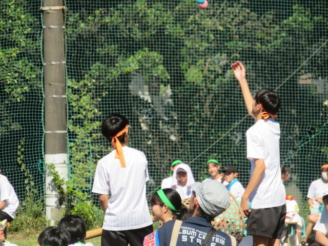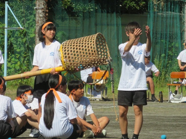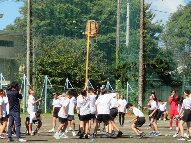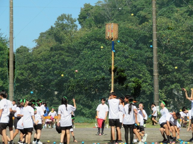 縦割り種目玉入れの様子です。中学生にとっても、なかなかの難しさがあるようです。玉が宙を飛び交いました。