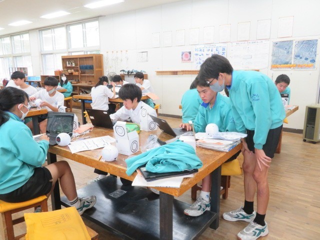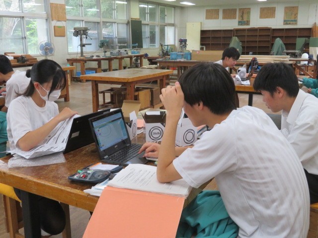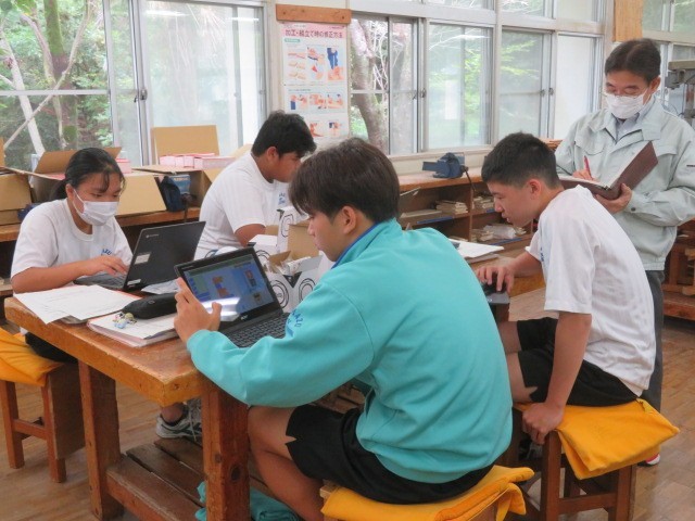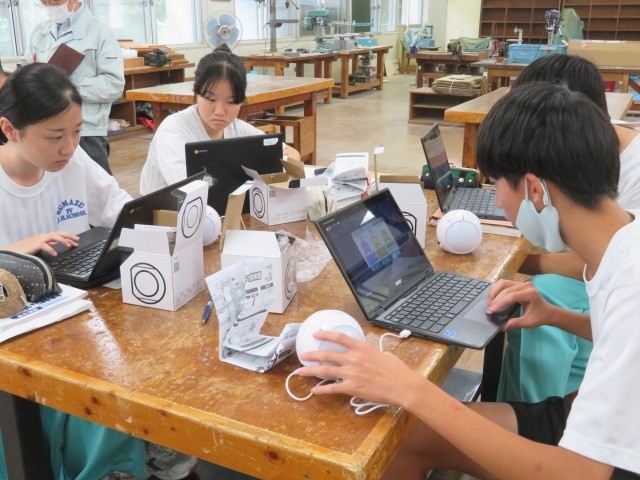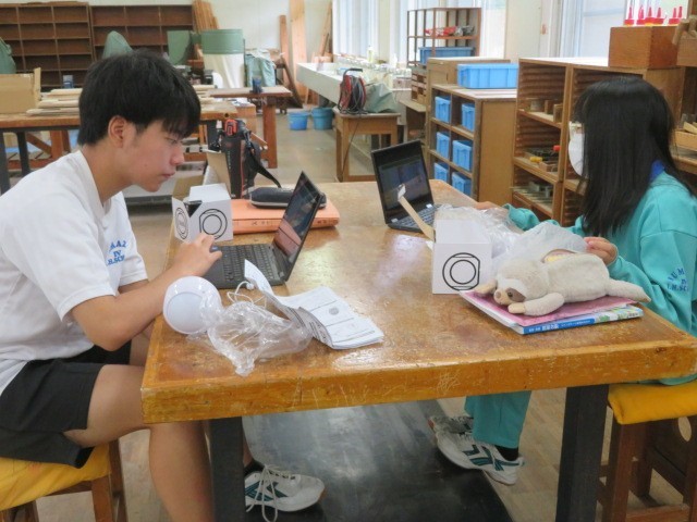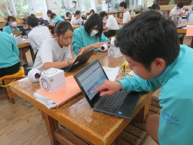 3年C組の技術の時間です。パソコンでプログラミングしてメロディーを作成し、端末から流します。