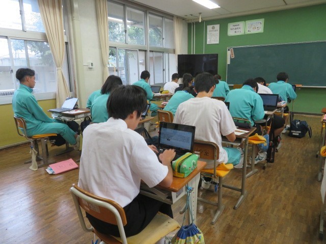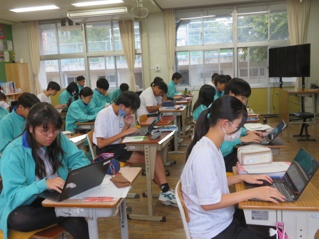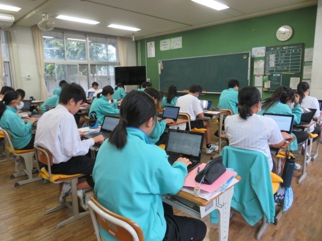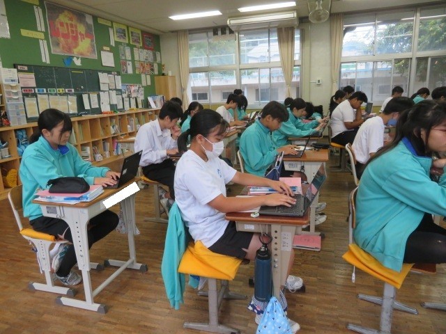 3年C組の国語の時間です。作文に取り組んでいます。日常生活の中で思うこと、自分の主張など3年生のいろいろな思いを打ち込んでいました。