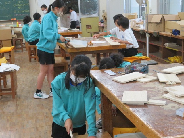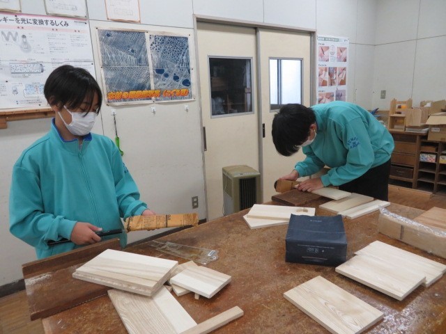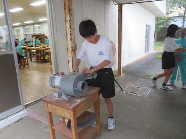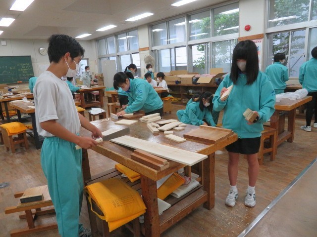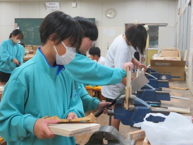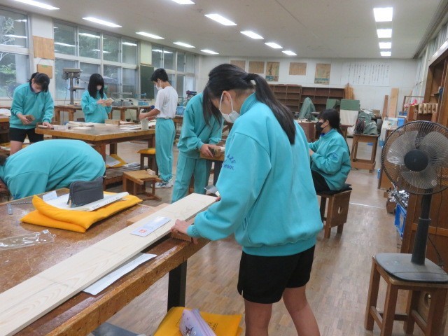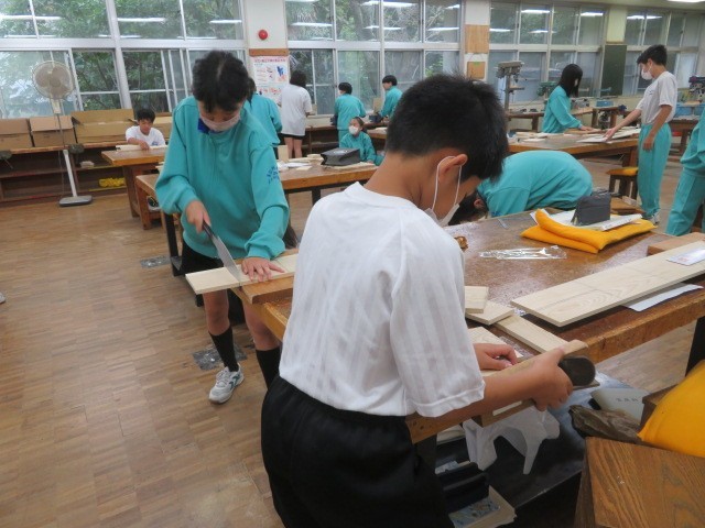 1年A組の技術の時間です。木材加工も大分作業が進んできました。完成まであと数時間はかかりそうですが、楽しみです。