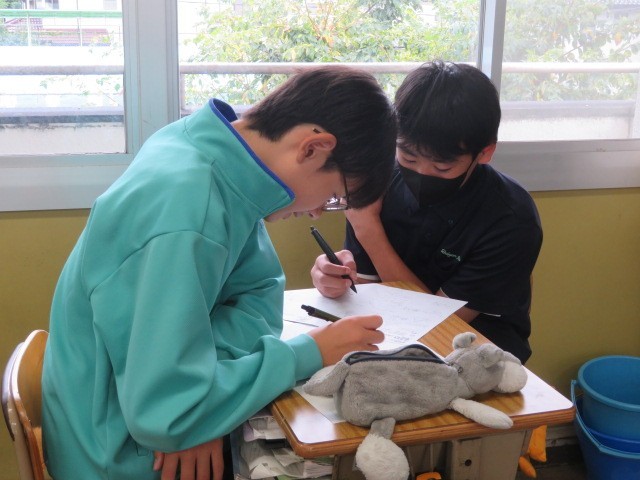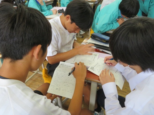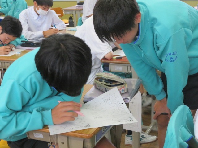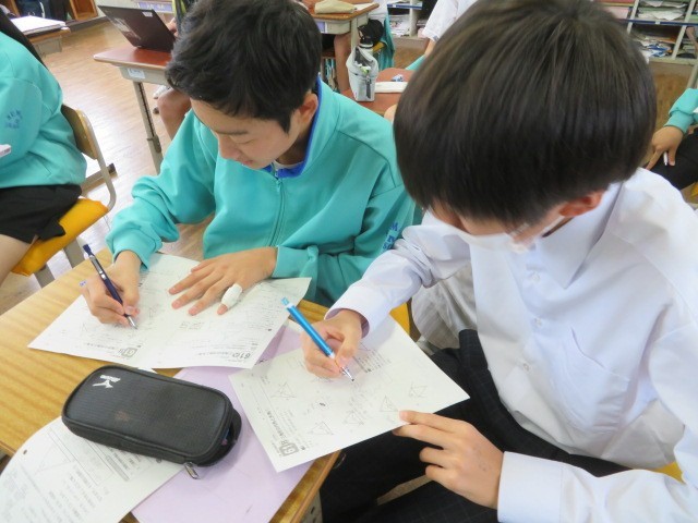 2年B組の数学の時間です。同位角や錯角などを用いて学習問題を解いています。