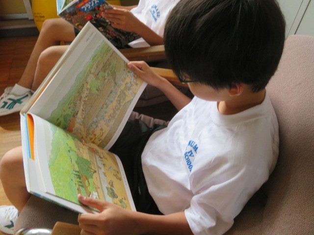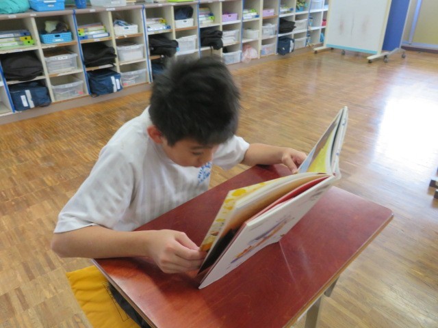 E組では、朝の活動を終えて、ゆったりと読書などで落ち着いた時間を過ごしていました。
