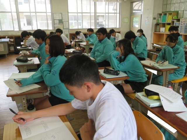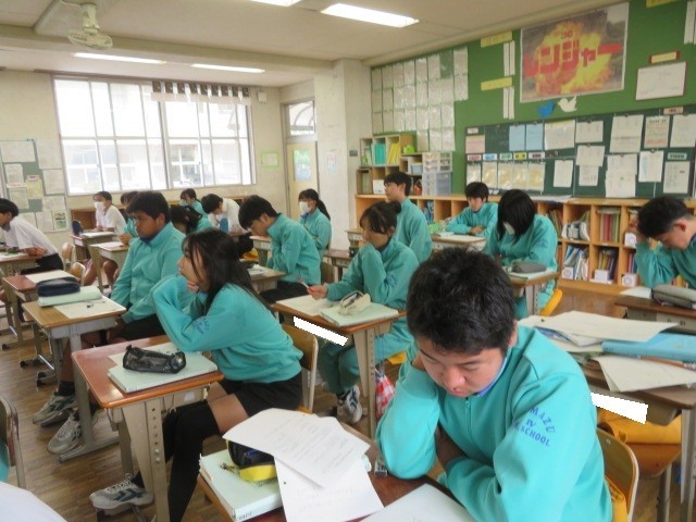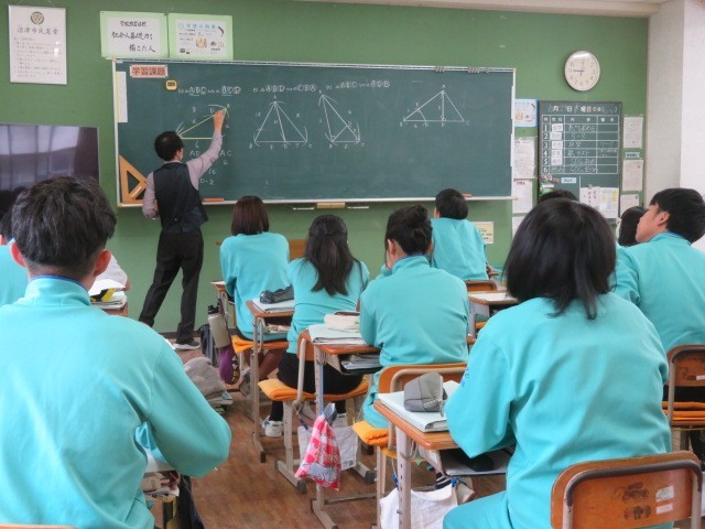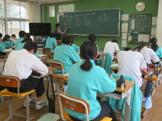3年C組の数学の時間です。「相似」を用いて、問題を解いていきます。