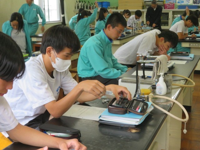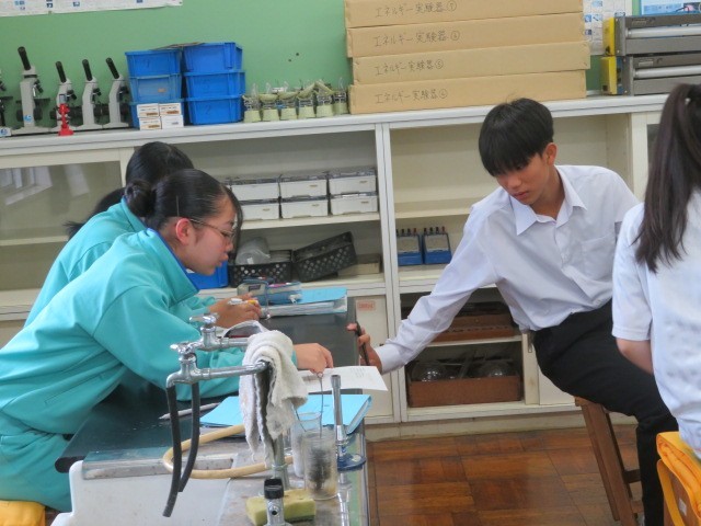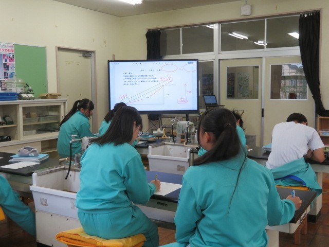3年A組の理科の時間です。「物体を動かす際に、道具を利用しても仕事の量は変わらない」という仕事の原理を用いて、問題を解いていました。