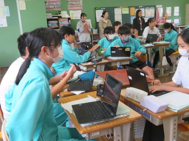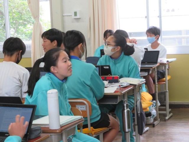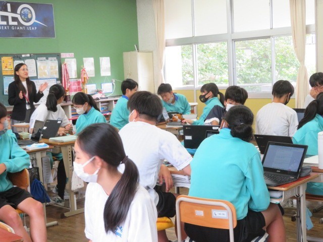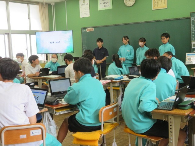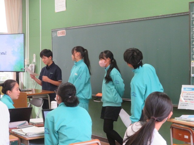 2年A組の英語の時間です。グループごとに非常時に必要な物を考え、プレゼンテーションを行います。よい発音で、堂々と発表をしていました。