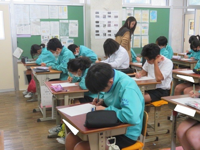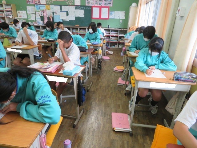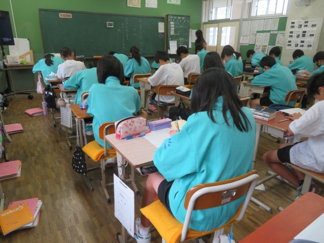 1年A組の国語の時間です。漢字のテストに取り組んでいます。すらすら書き進める人、一生懸命思い出そうとしている人、それぞれに問題用紙と向き合っていました。