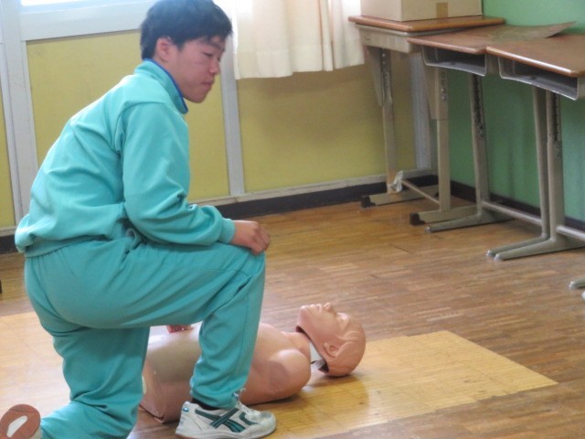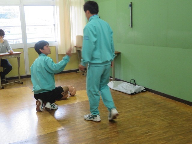 2年B組の保健体育の時間です。傷病者を発見したときの対応について確認をしています。安全の確認、意識の確認、胸骨圧迫、人工呼吸等正しく行えるように進めています。