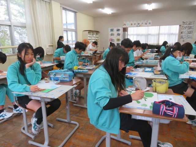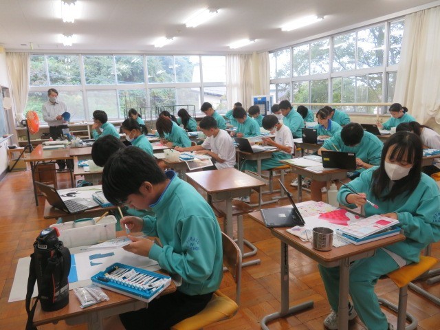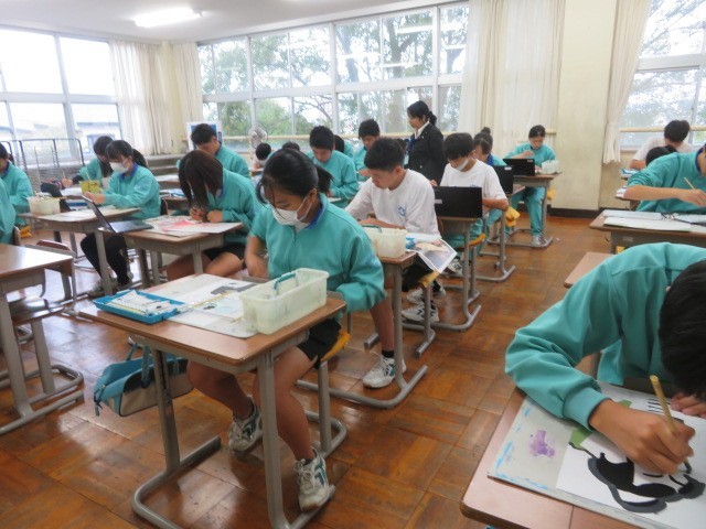 3年C組の美術の時間です。着彩もどんどん進んでいます。塗り方の技法について、先生のアドバイスに耳を傾けていました