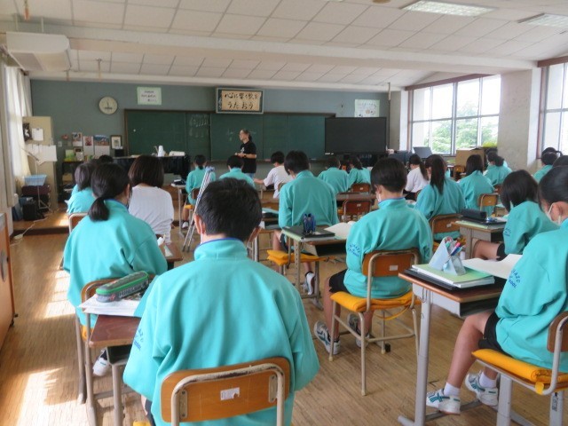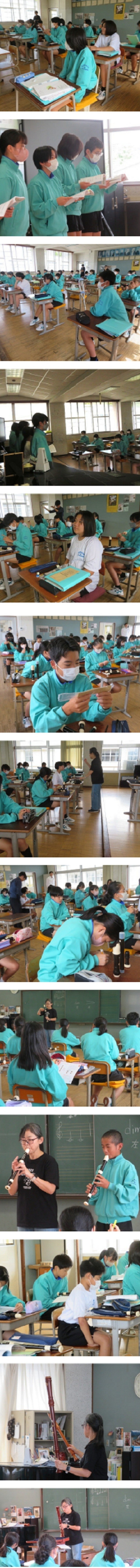 1年A組の音楽の時間です。今日からアルトリコーダーの学習に入ります。小学校までのソプラノリコーダーよりひとまわり大きくなったアルトリコーダーを手にうれしそうに見えました。ソプラニーノリコーダー、ソプラノリコーダー、アルトリコーダー、テナーリコーダー、バスリコーダーの大きさや音域の違いも体感しました。