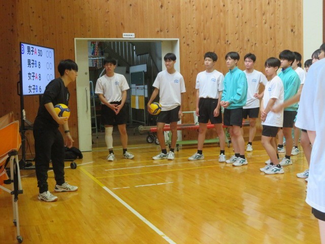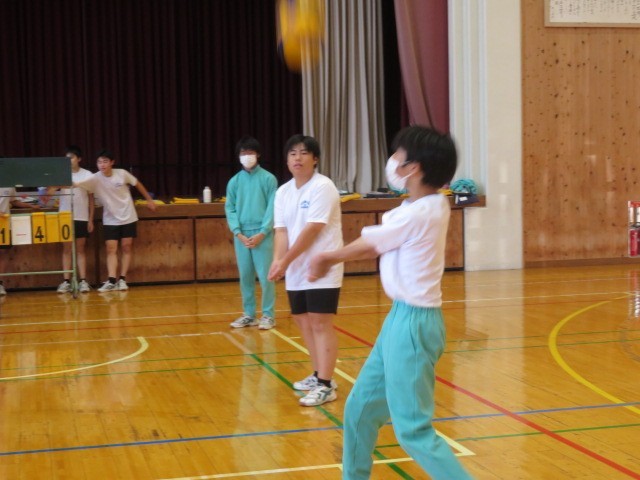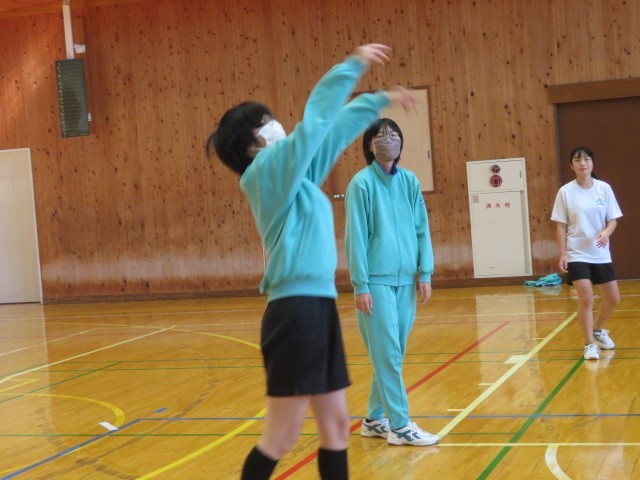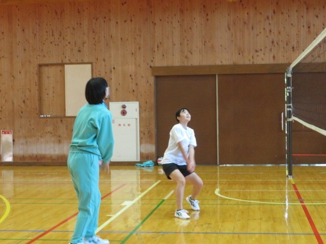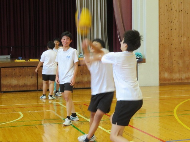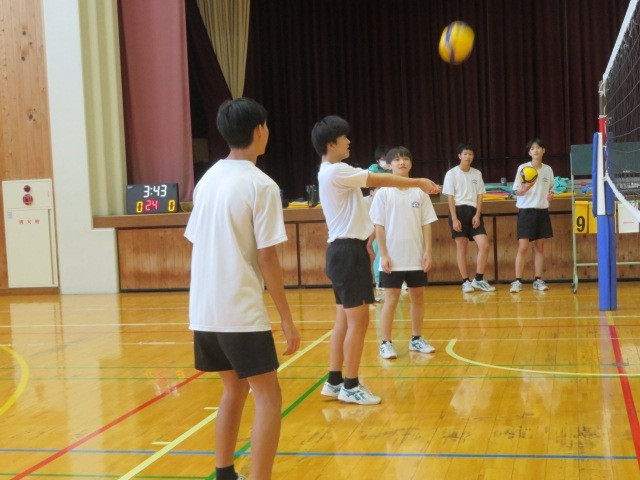 3年B組の保健体育の時間です。バレーボールの学習に取り組んでいます。アンダーパスの膝の使い方、腕の振り方の確認、ネットを挟んでの競技などを行っています。