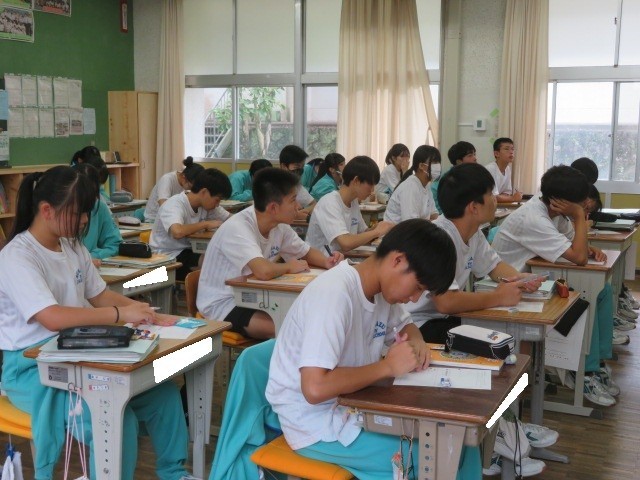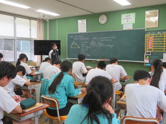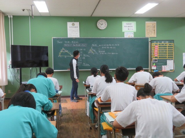 3年A組の数学の時間です。平行線と線分の比を用いて、図形の相似を証明していきます。