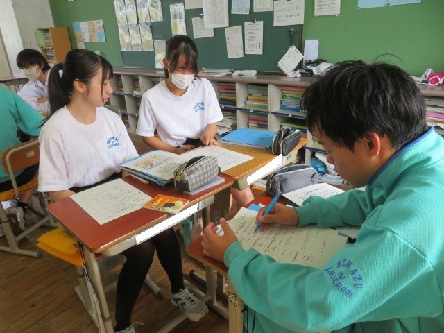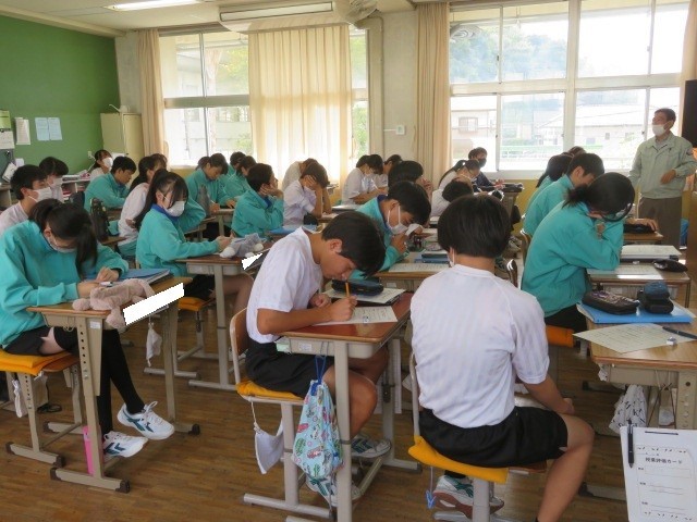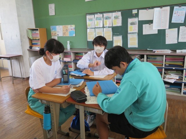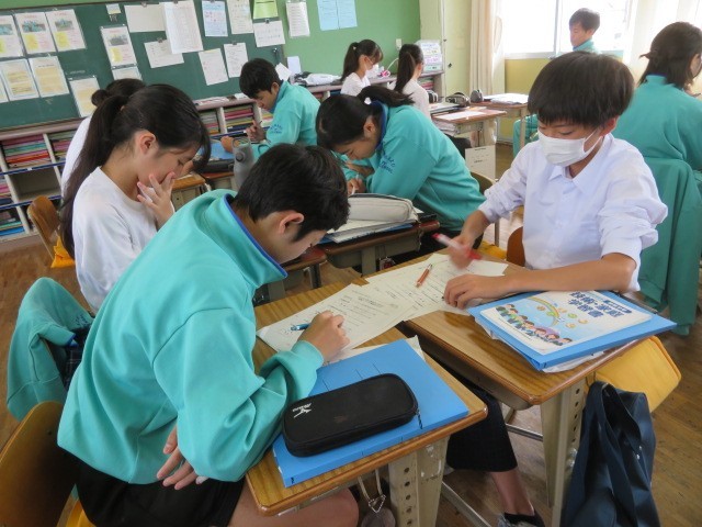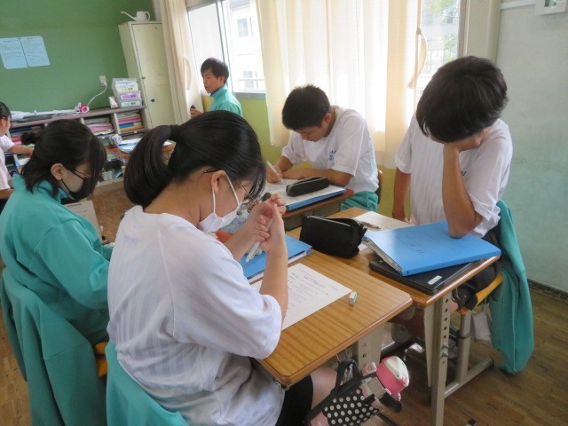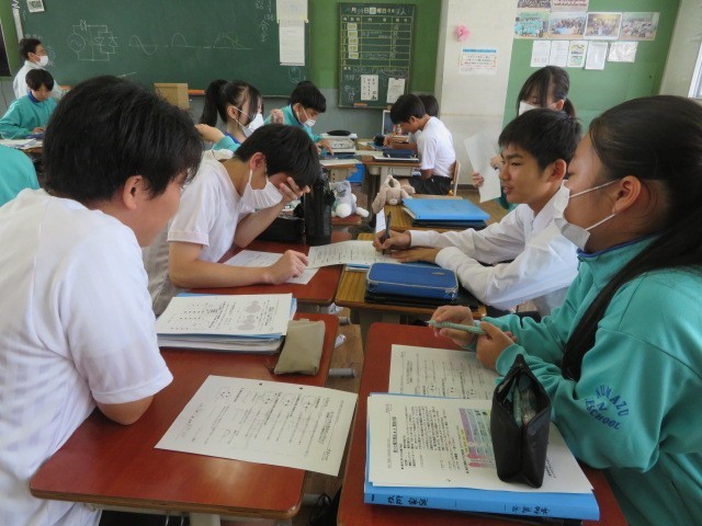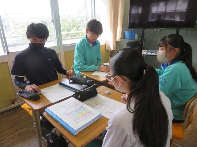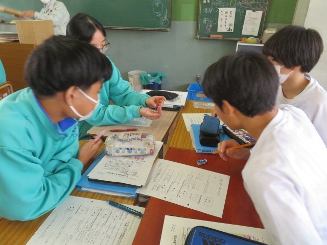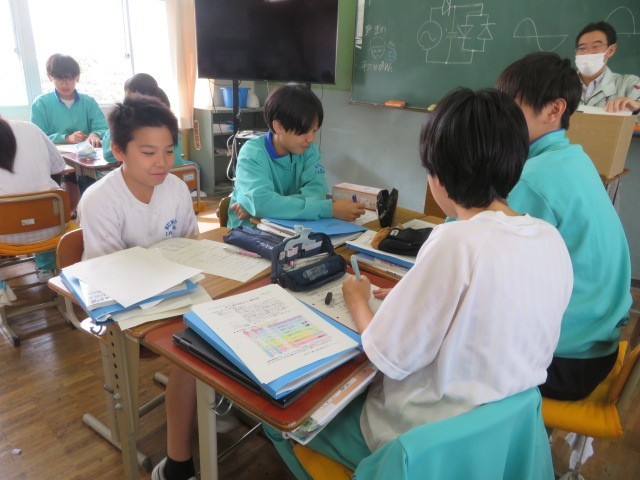 2年B組の技術の時間です。ダイオードによる整流について考えています。複数のダイオードが設置された回路の波形についてグループで考えています。