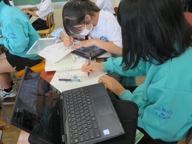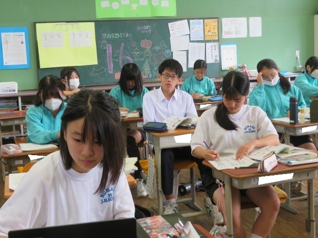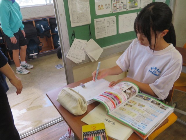 1年B組の家庭科の時間です。防災カルタを作成しています。作成を終えてメラミンスポンジを使って廊下の汚れを落としています。家庭でもどんどんお手伝いをしたいですね。