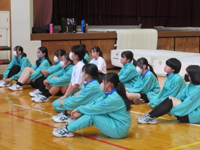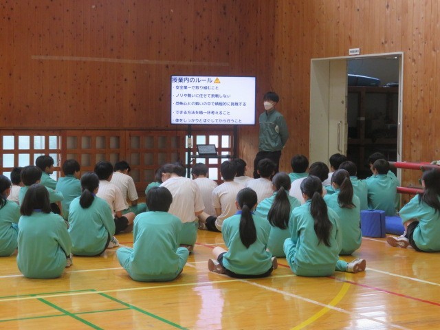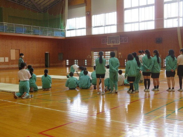 2年B組の保健体育の時間です。正しく運動し、けがをしないための注意点を一つ一つ確認しました。技能向上に向けて頑張っていきます。