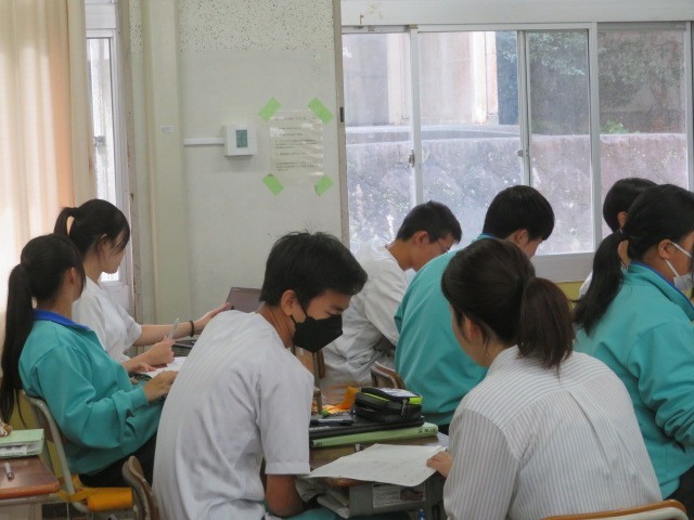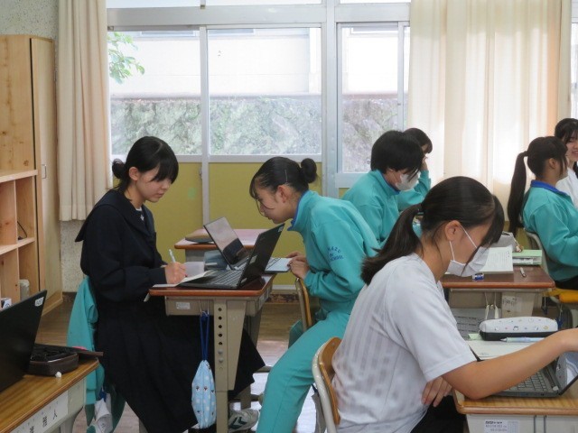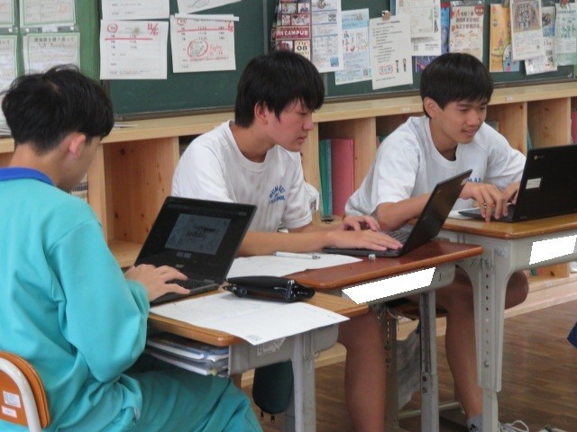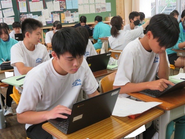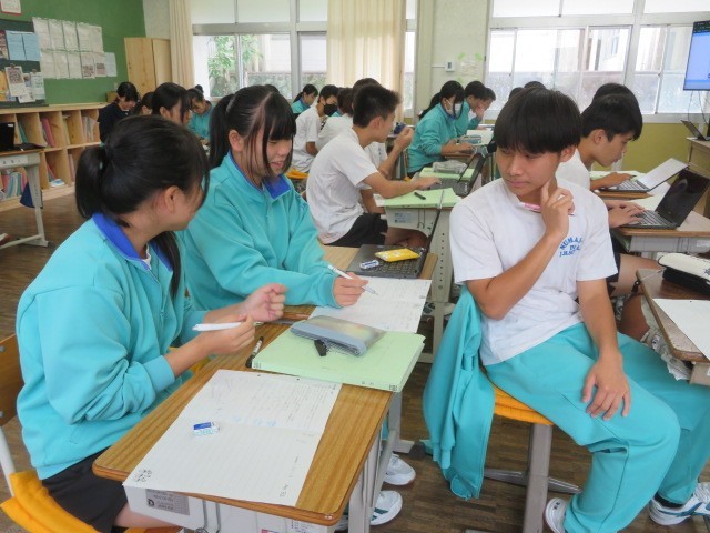 3年A組の英語の時間です。英語スピーチの原稿を作成しています。いくつかのフレーズを書き出して構成を考えている生徒さんもいます。
