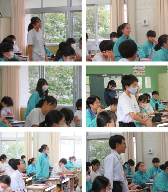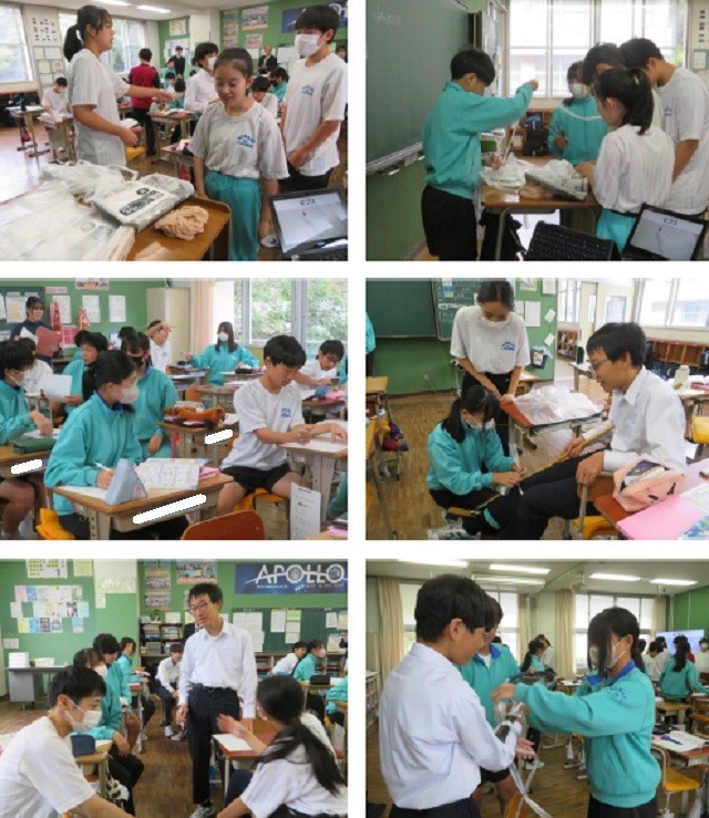 2年A組の保健体育の時間です。応急手当について学び、いざというときに身のまわりのもので対応できるように考えました。