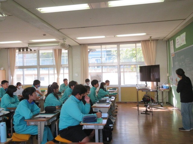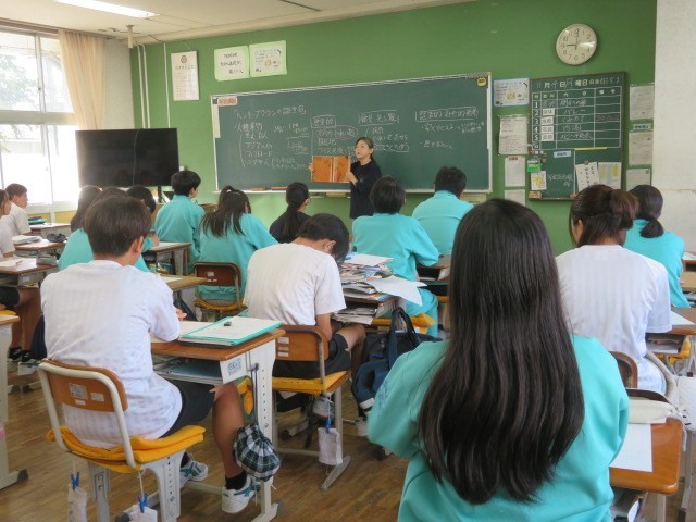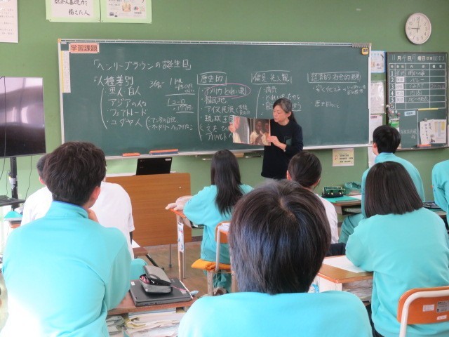 3年C組の道徳の時間です。かつてのアメリカを舞台とし、「人種差別」に苦しむ人々がいたお話です。先生の範読に、真剣に耳を傾けていました。