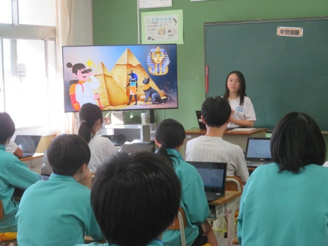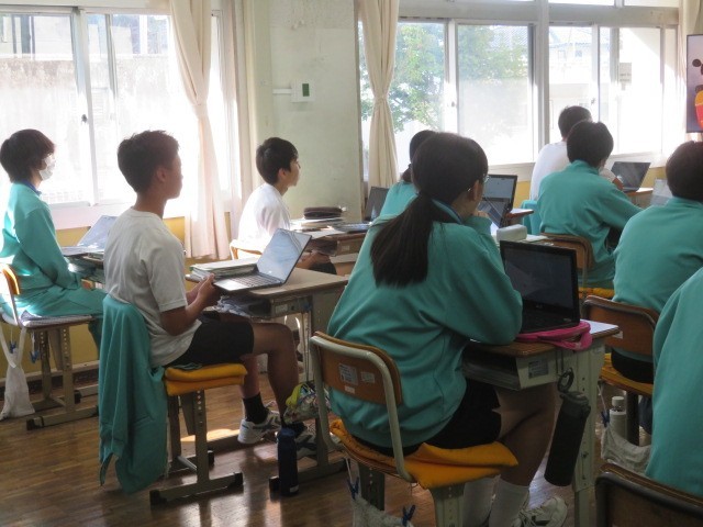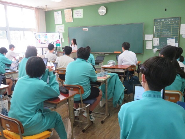 3年B組の英語の時間です。パフォーマンステスト、将来の夢・未来の自分について発表しています。
