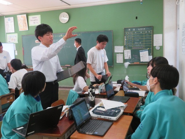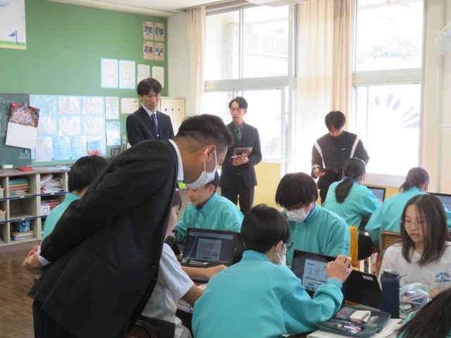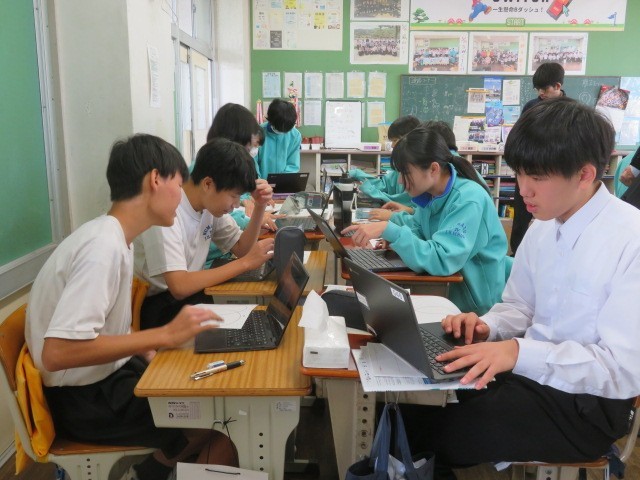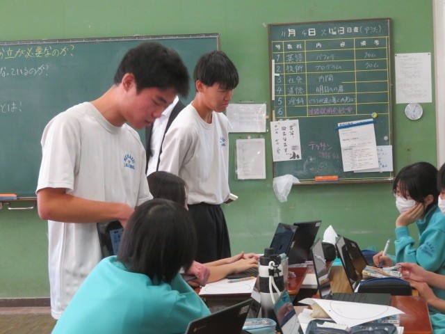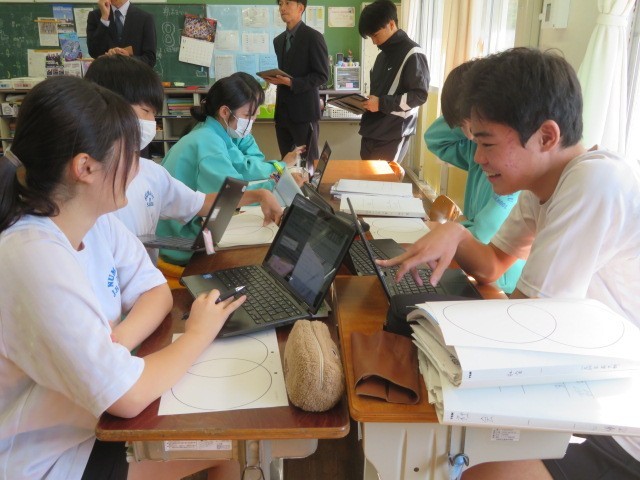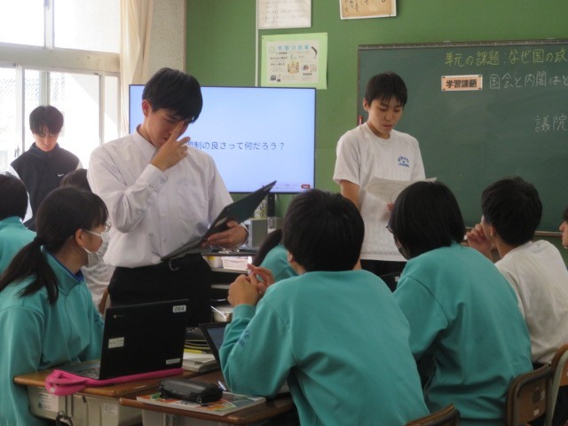 3年B組の社会の時間です。行政についての学習です。「議院内閣制」「大統領制と議院内閣制の違い」などを学びながら、議院内閣制の利点について意見を交換しています。