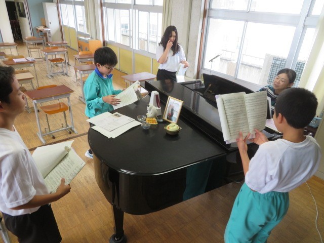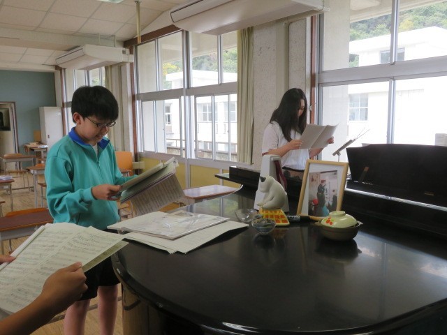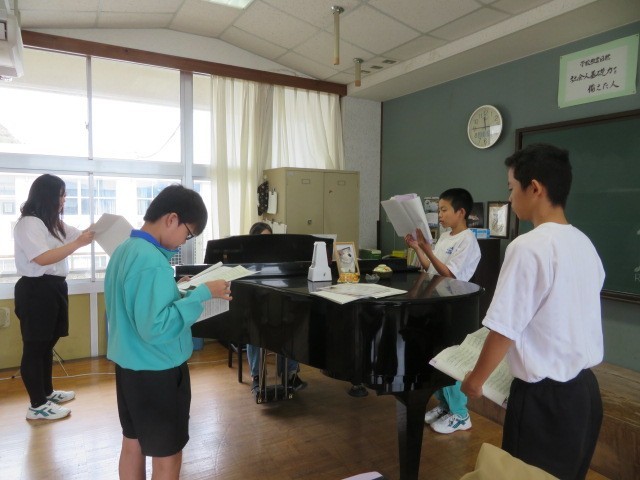 E組の音楽の時間です。菓子に合わせた歌い方の工夫などに気をつけながら合唱に取り組んでいます。