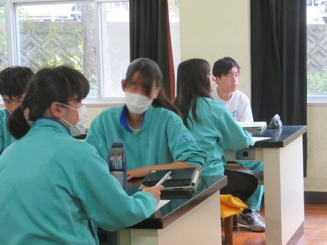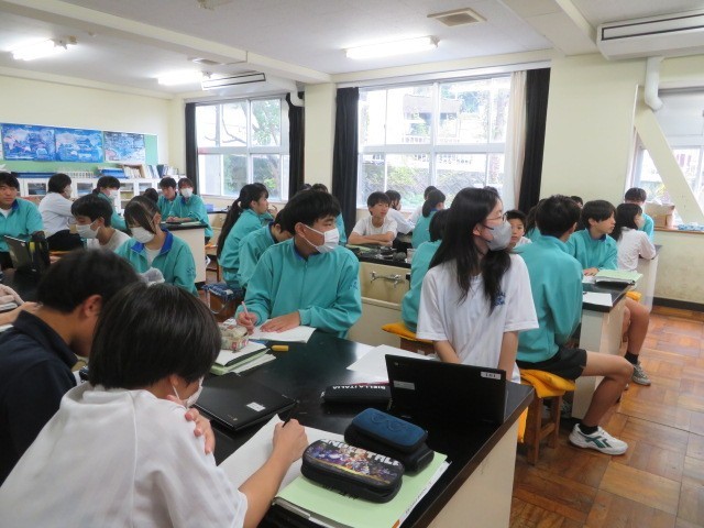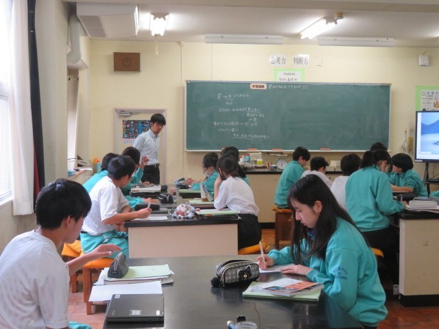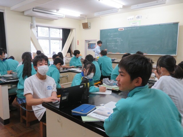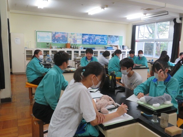 2年B組の理科の時間です。「雲」のでき方について学習しています。気温や気圧の標高(地上の高さ)との関係などを考えます。