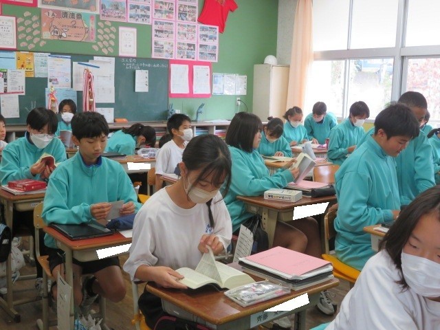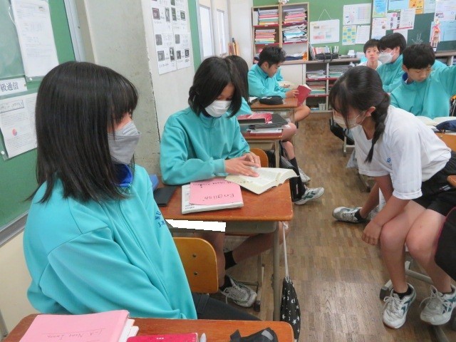 1年A組の英語の時間です。和英辞典を使って、先生から出された単語を調べていきます。インターネットを使って調べることもできますが、和英辞典・英和辞典を手元に置いて調べる習慣が身につくといいですね。