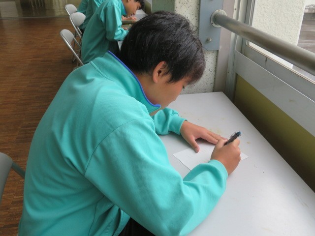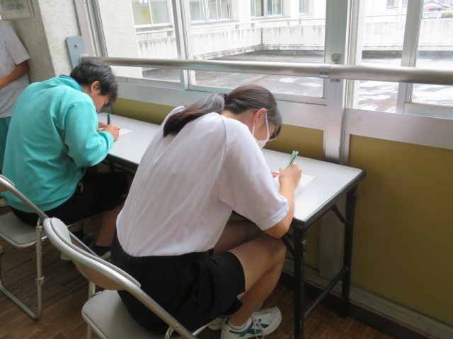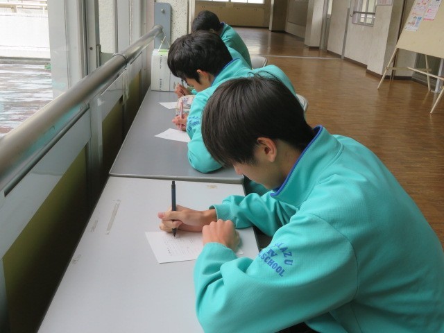 昼休みの中央廊下の様子です。隙間時間にちょっと問題に取り組める場所があります。声をかけられたり、通りがかったりした生徒さんが取り組んでくれました。