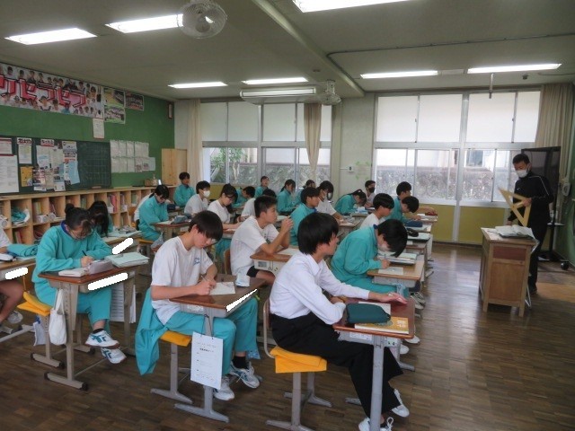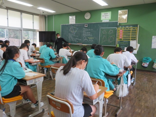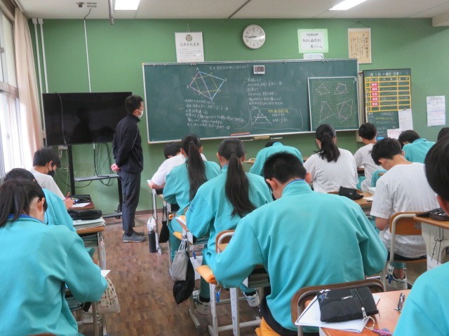3年A組の数学の時間です。「中点連結定理」を学習しています。新たな定理を学んだことにより、証明問題の幅が広がっていきます。