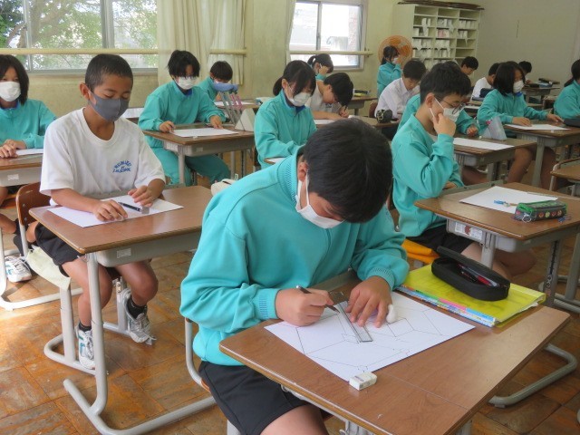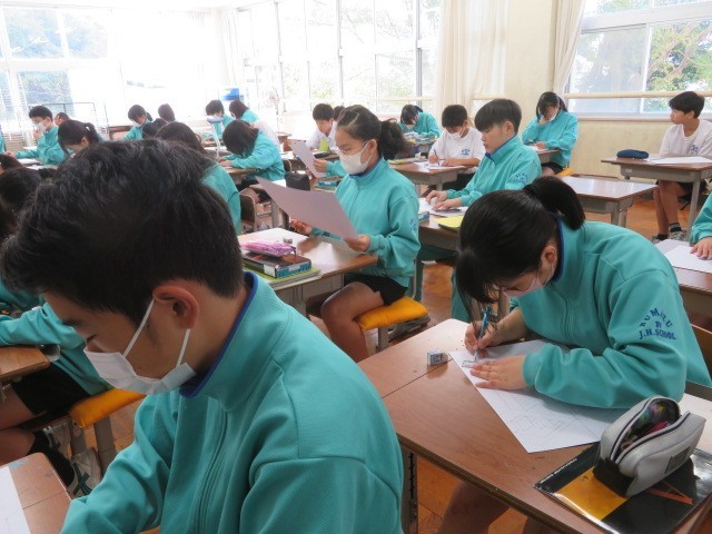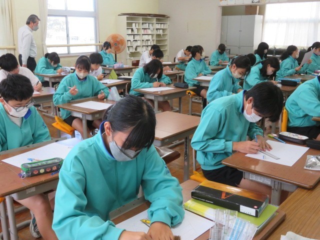 1年A組の美術の時間です。図形も上に置かれているように見えたり、奥に引っ込んでいるように見えたり、デザインによりいろいろな見え方をしています。