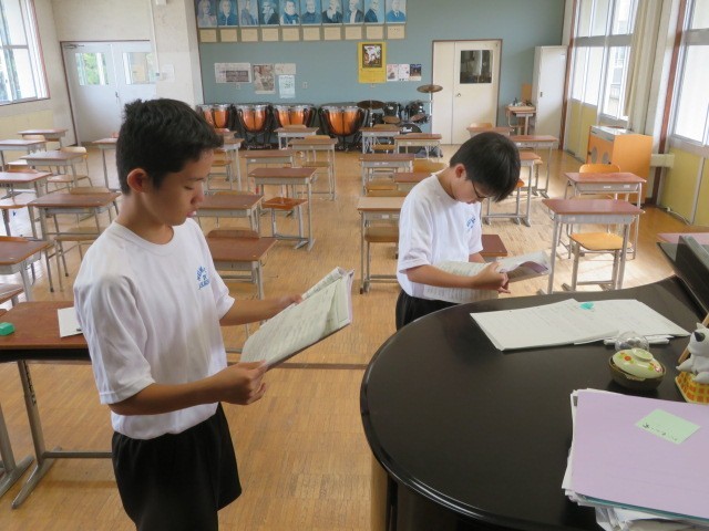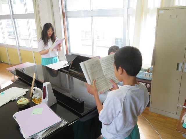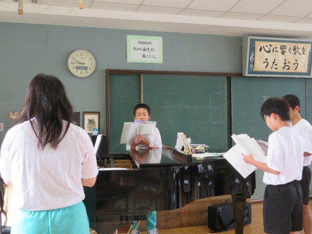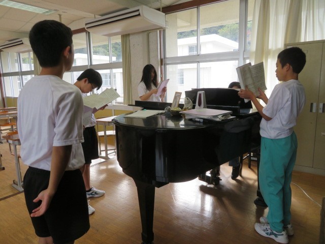 E組の音楽の時間です。先生のピアノに合わせて、「Replay」を合唱しています。