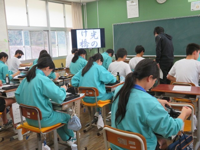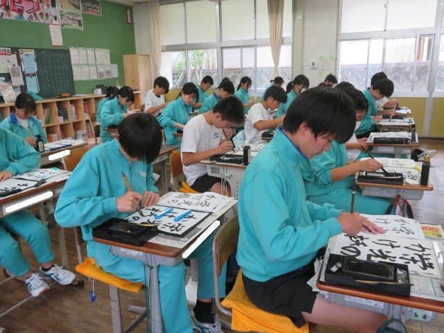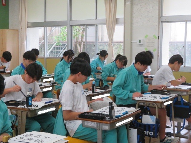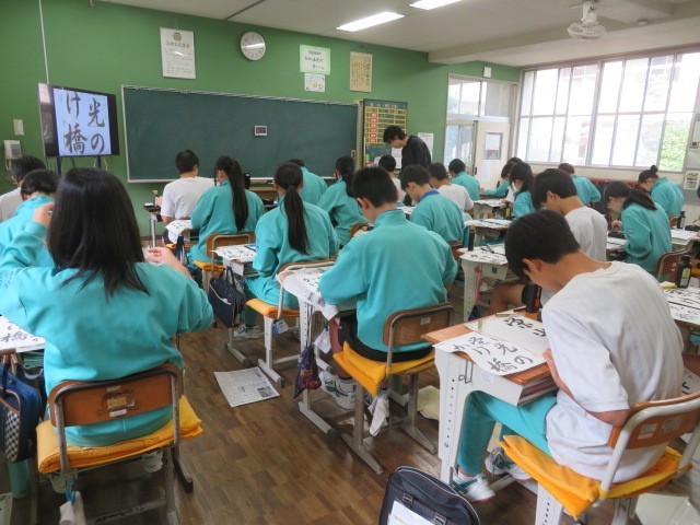 3年生の国語の時間です。書写に取り組んでいます。「栄光の架け橋」、しっかりとした筆遣いで書いています。