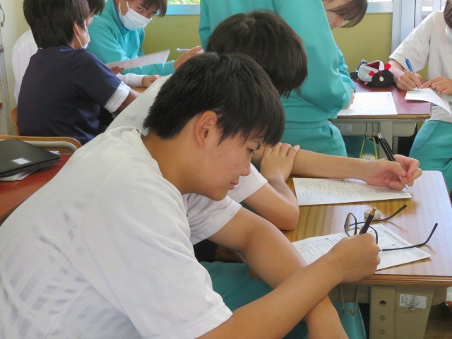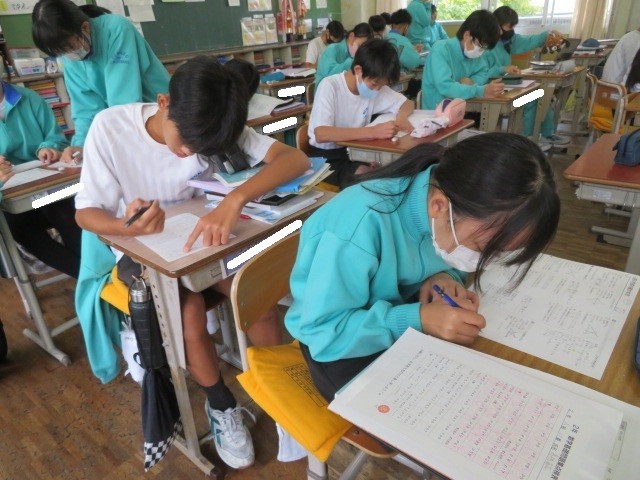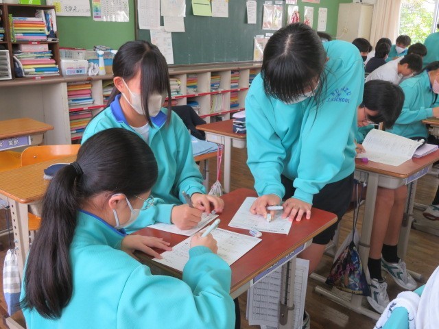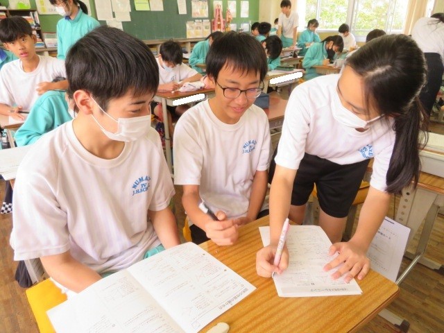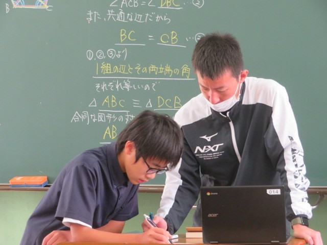 2年A組の数学の時間です。証明問題など、個人で取り組む生徒、教え会いながら学習する生徒、先生に質問に行く生徒、それぞれに取り組んでいます。