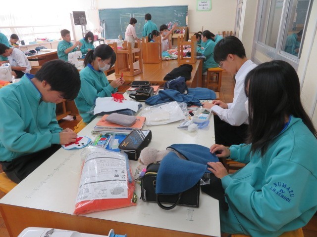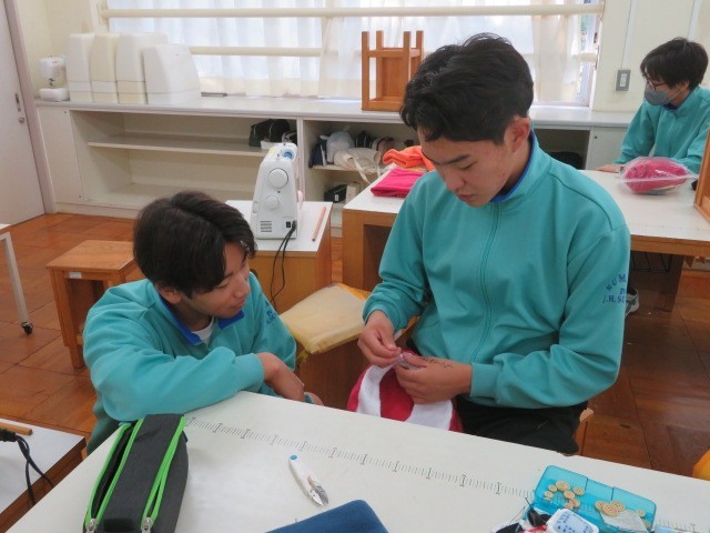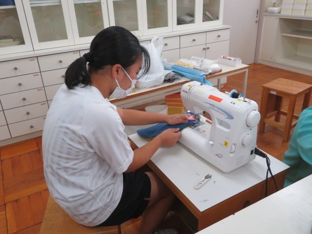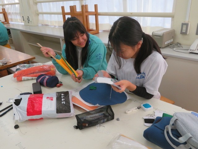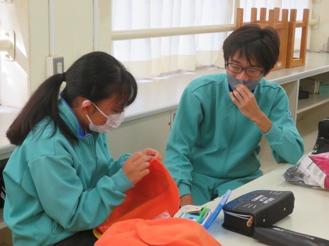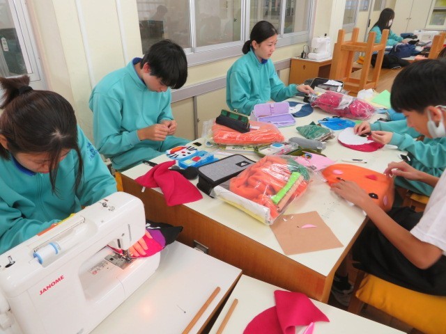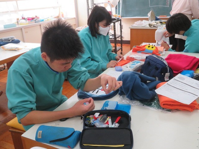 3年C組の家庭科の時間です。あったかブランケット、ミシン縫い、手縫い、作業をそれぞれ進めています。完成が近づいてきました。