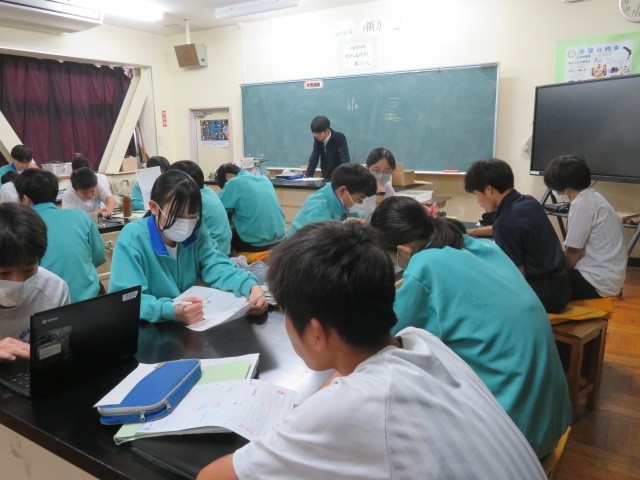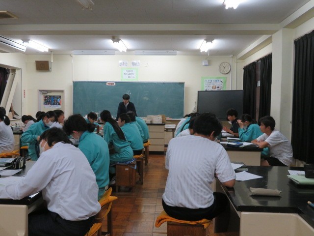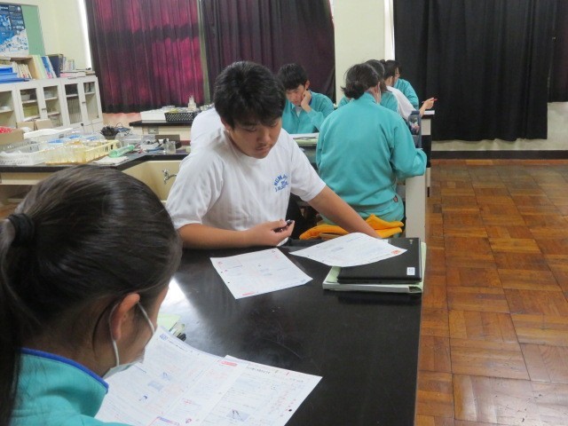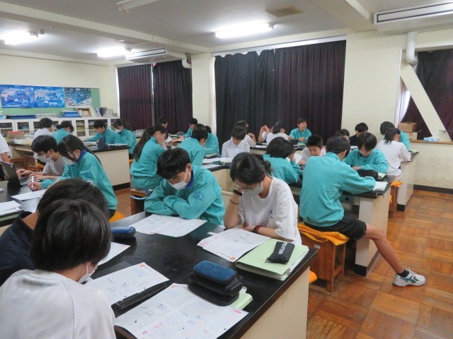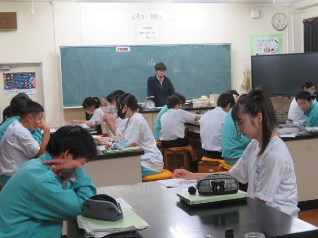 2年B組の理科の時間です。「地球を取りまく大気のようす」の単元テストが返却され、先生から解答の際に注意すべきについて確認がありました。今週の学力テストを前に再確認しておきたいですね。