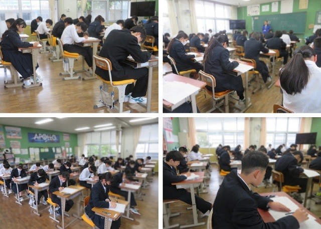 2学期の学力テストです。これまでの学習の成果を発揮し、熱心に問題に取り組んでいます。