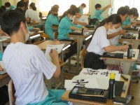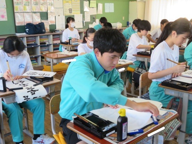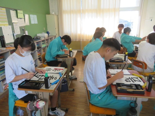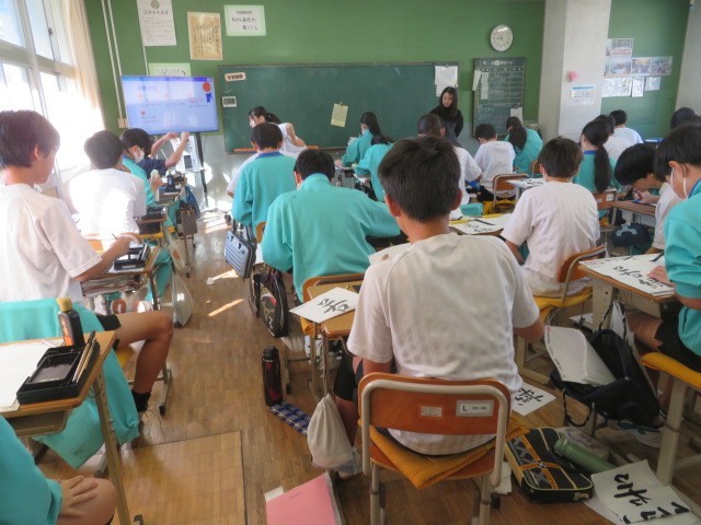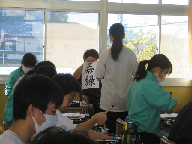 2年B組の国語の時間です。筆を立て、「若緑」を書き上げていきます。