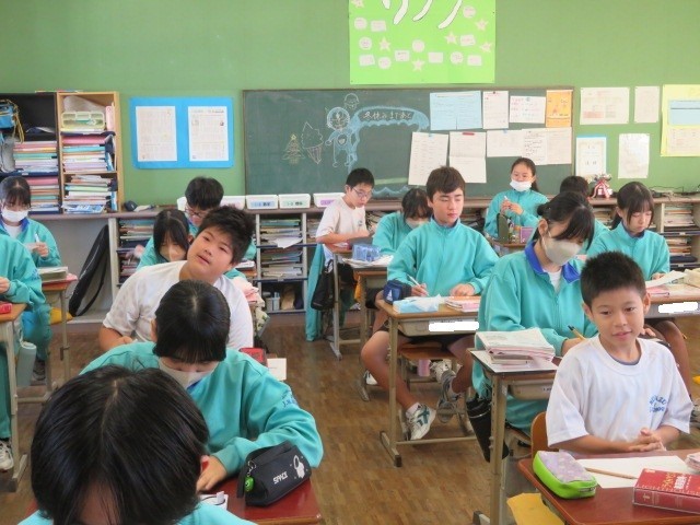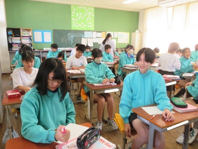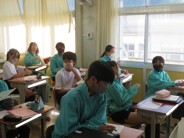 1年B組の英語の時間です。1Bの紹介ブックを作成に向けた取り組みについて話を進めています。