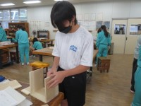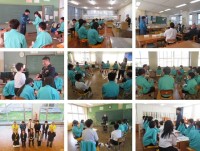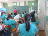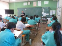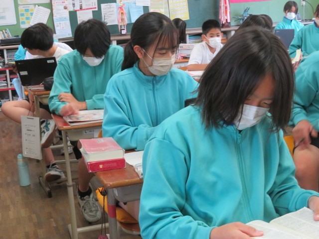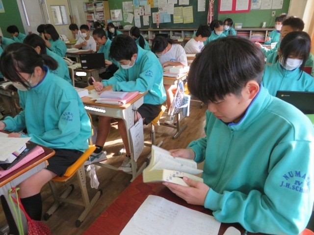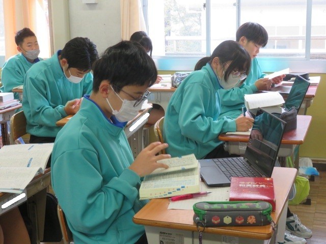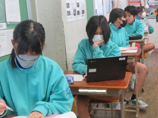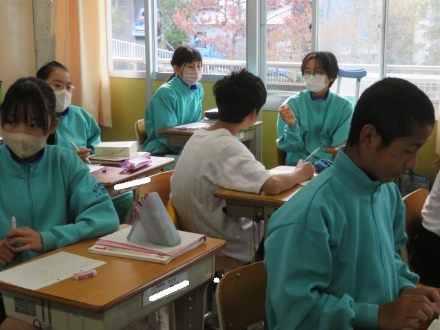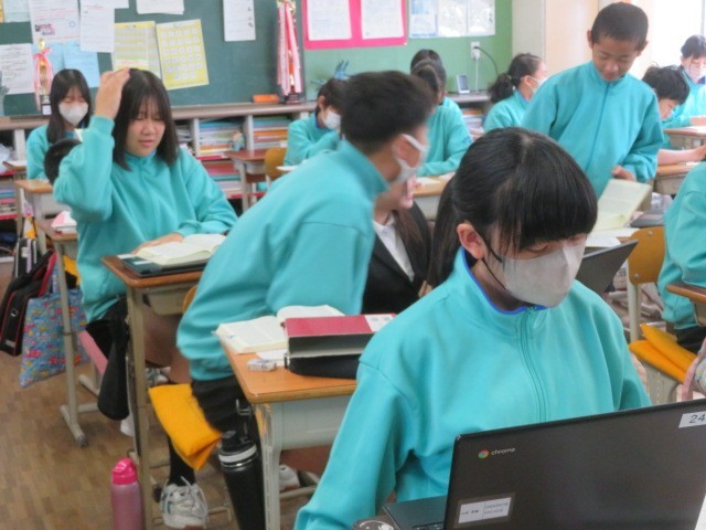 1年A組の英語の時間です。隣の席の友達の紹介文を書いています。趣味や特技などについて上手な説明文を考えています。