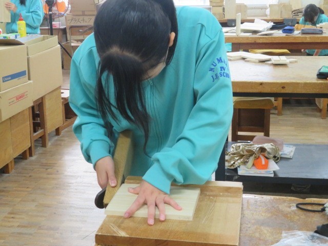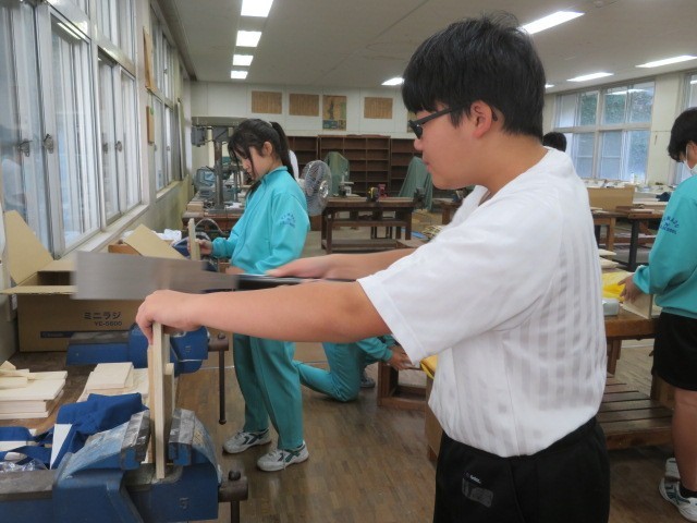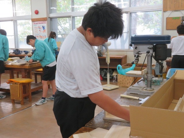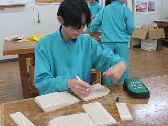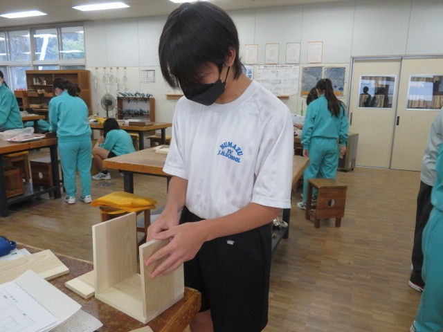 1年B組の技術科の時間です。木材加工も完成が近づいている人もいます。組み立てのイメージが大分進んでいます。